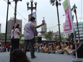 | 高雄連續幾天豔陽高照的天氣,卻在簽唱會當天中午下起傾澎大雨來, 抵達簽唱會現場時,現場聚集群眾不太多 讓Hit Fm90.1高屏電台的工作人員相當擔心,不過,好像奇蹟一般,越接近簽唱會時間,雨勢就越來越小, 到簽唱會前半小時,還可看到太陽露臉,主持人--馬路DJ--HUGO上台暖場時,心情也隨著天氣越來越High,現場群眾聚集當然也是越來越多囉!!